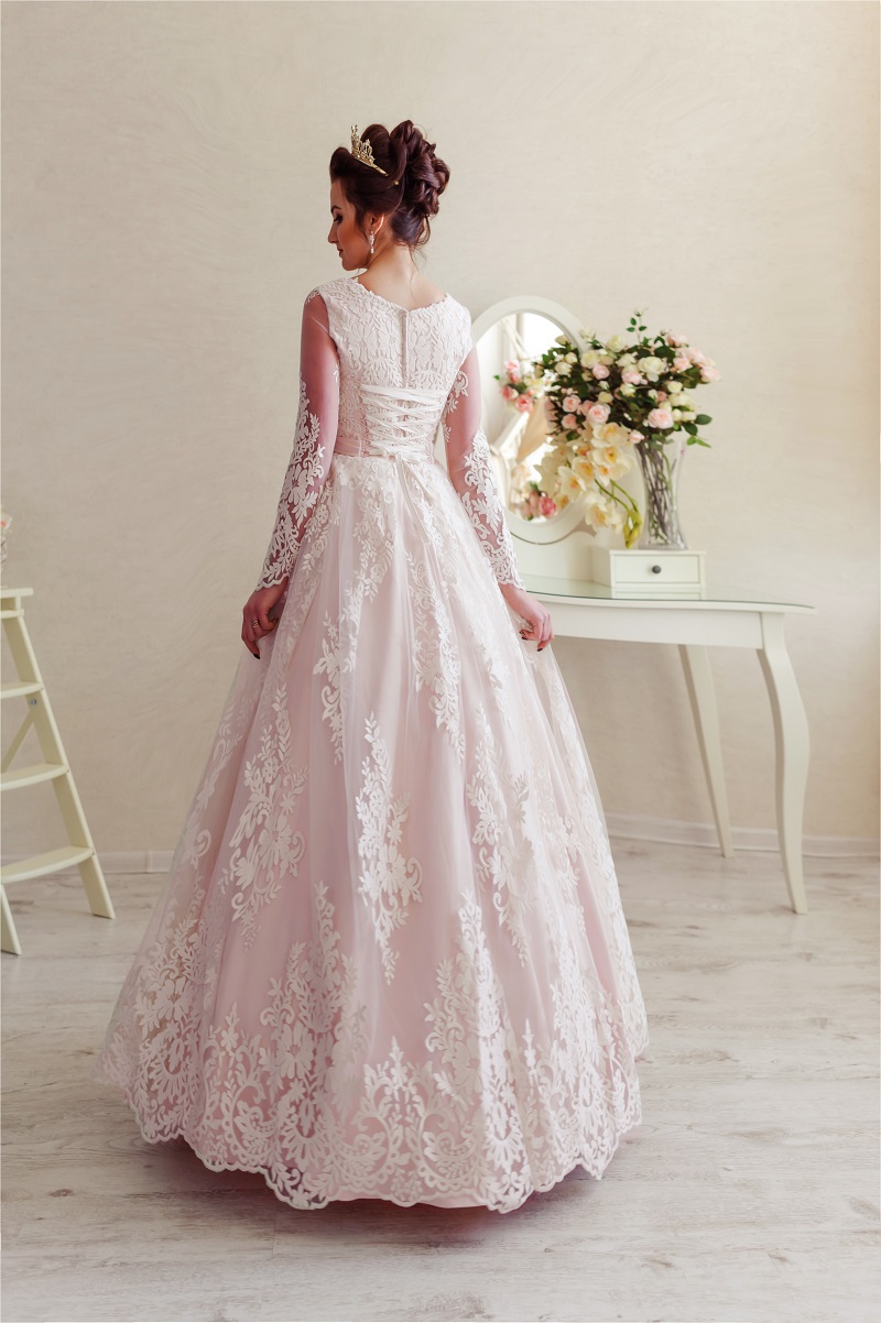 Вишукане плаття Eleonora зробить образ нареченої неперевершеним. Неповторне мереживо ніжно огортає корсет плаття. Елегантне стримане декольте підкреслює лінію вилиць. Вишукана атласна спідниця пудового кольору покрита кружевом, яке робить сукню повітряною та невагомою. Дуже красиво підкреслює талію пояс з бантіком, що робить її ще більш витонченішою. Завершують образ ніжні круживні рукава, які огортають тендітні руки нареченої.