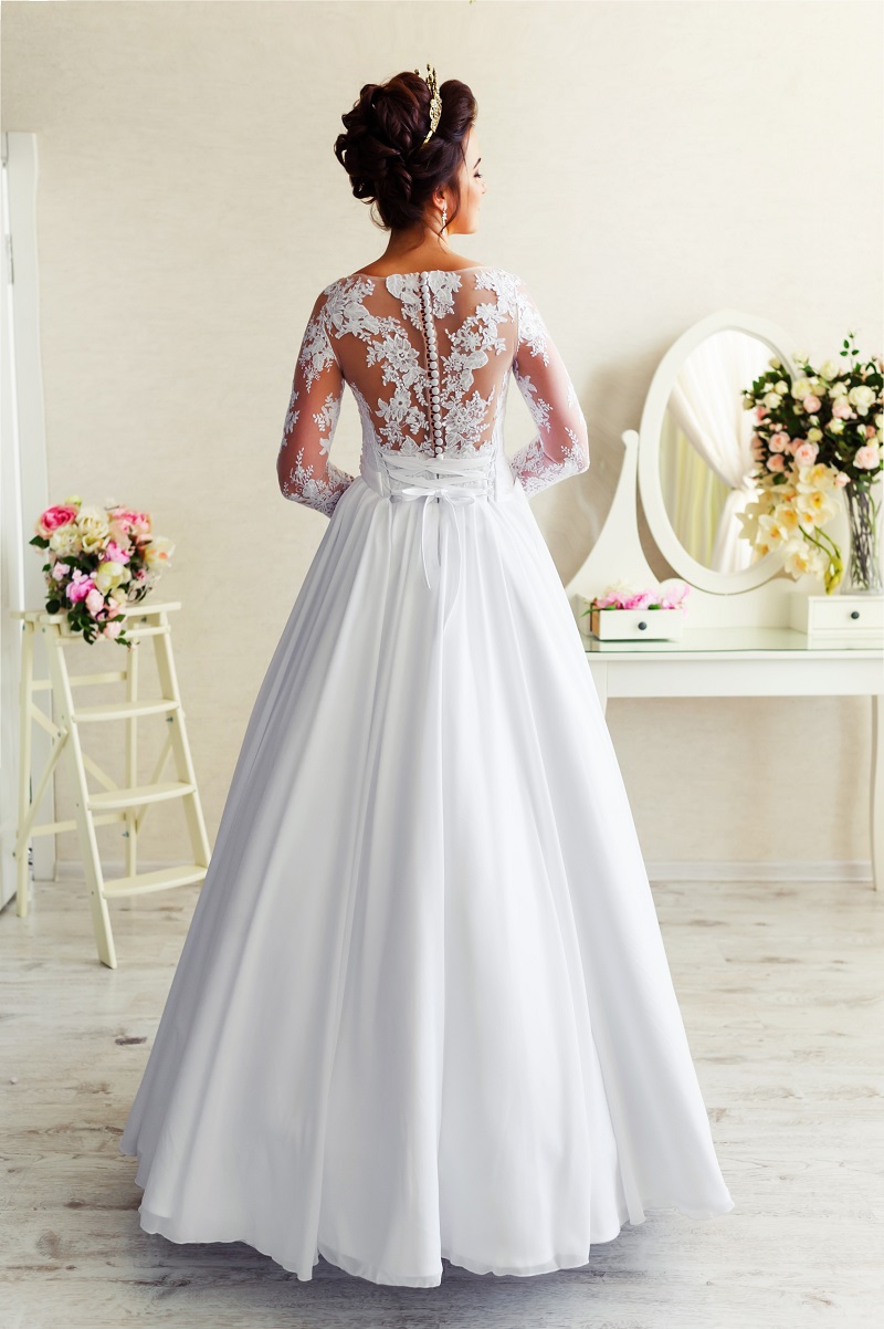 Ніжна та особлива сукня Elis для вишуканих наречених, які цінують елегантність та простоту. Ніжний білий шифон спадає водоспадом додолу, видовжуючи силует та підкреслюючи тендітність талії. Вишукане кружево підкреслює всю красу та ніжність володарки сукні. Фактурні аплікації приваблюють погляд та ніжно лягають на тендітні руки нареченої.